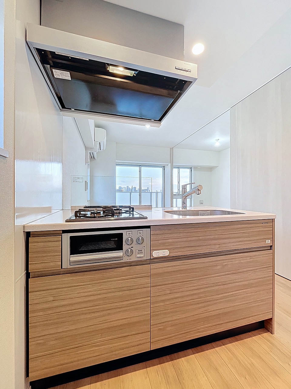 カウンターキッチンを採用し、開放感のある空間で料理を楽しめます。ガス2口コンロにグリル付きで、同時調理もスムーズ。毎日の自炊をしっかりサポートする、使い勝手の良いキッチン設備です。