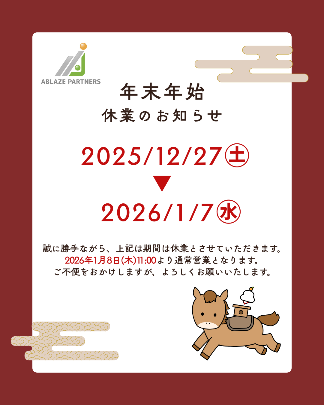 【休業期間】2025年12月27日(土)~2026年1月7日(水)